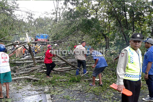 Akibatnya sejumlah pepohonan tumbang. Di antaranya berukuran cukup besar, diameter 1m. Pepohonan itu tumbang di Jl Raya Wonogiri – Ponorogo Km 12 tepatnya di Sidokriyo Ngadirojo Wonogiri.