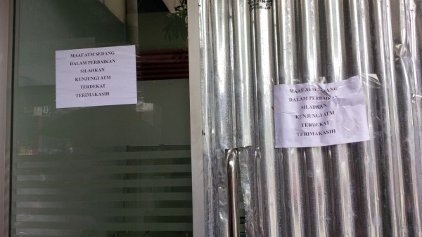 Foto diambil pada hari Minggu (10/4/2016) di pojok sisi selatan pasar di jantung kota Wonogiri. Ternyata hal yang sama terjadi di Kios ATM Kantor BRI cabang Wonogiri. “ATM sedang dalam perbaikan mas,” begitu kata petugas keamanan BRI Cabang Wonogiri Kota. Dia menyarankan agar nasabah mengunjungi ATM bersama untuk melakukan transaksi. “Sedang rusak jaringannya,” kata satpam itu lagi.